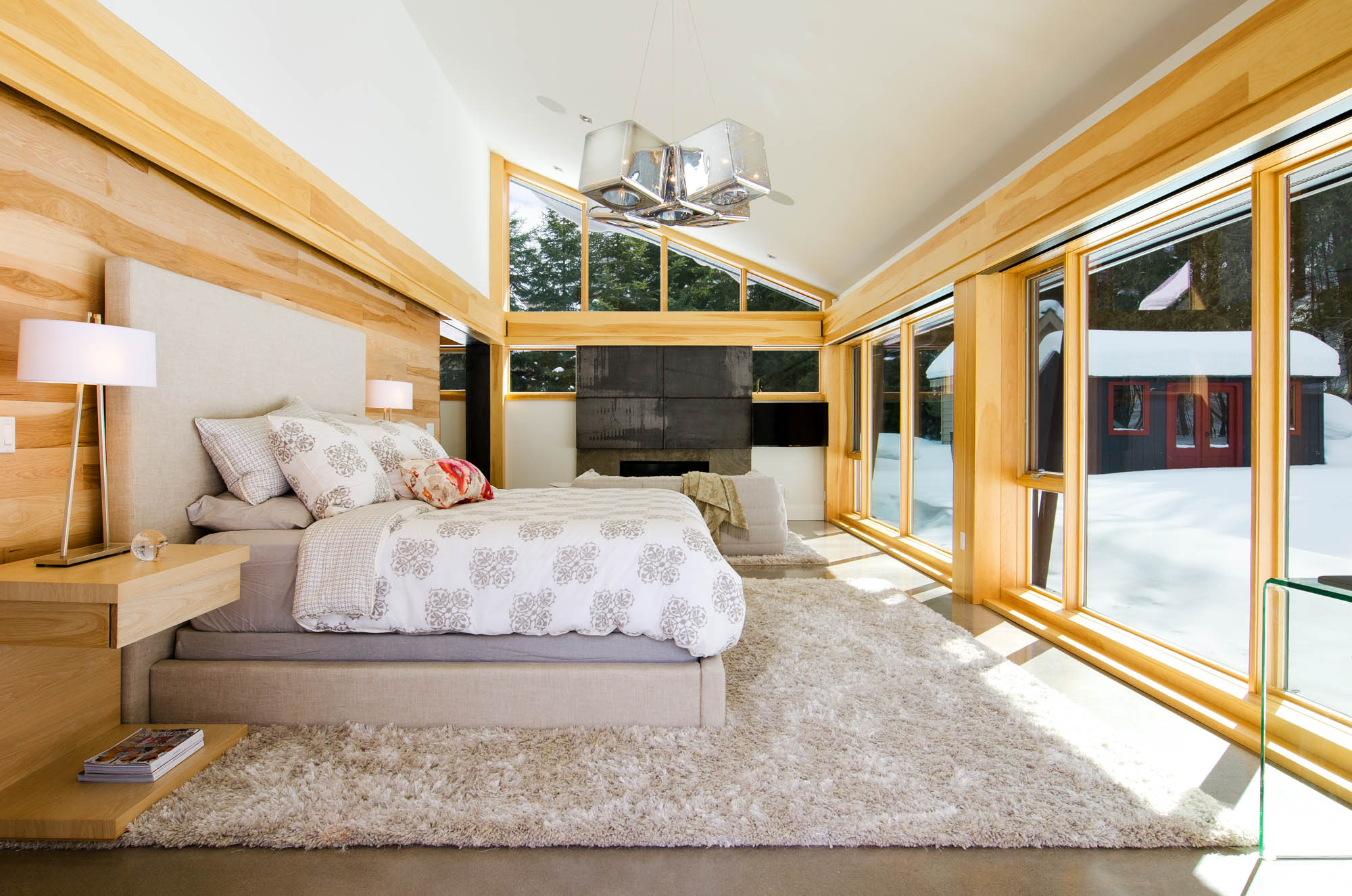 Three-sided wood view, hickory beams and heated poured concrete floors give the primary suite a spa-like feel.